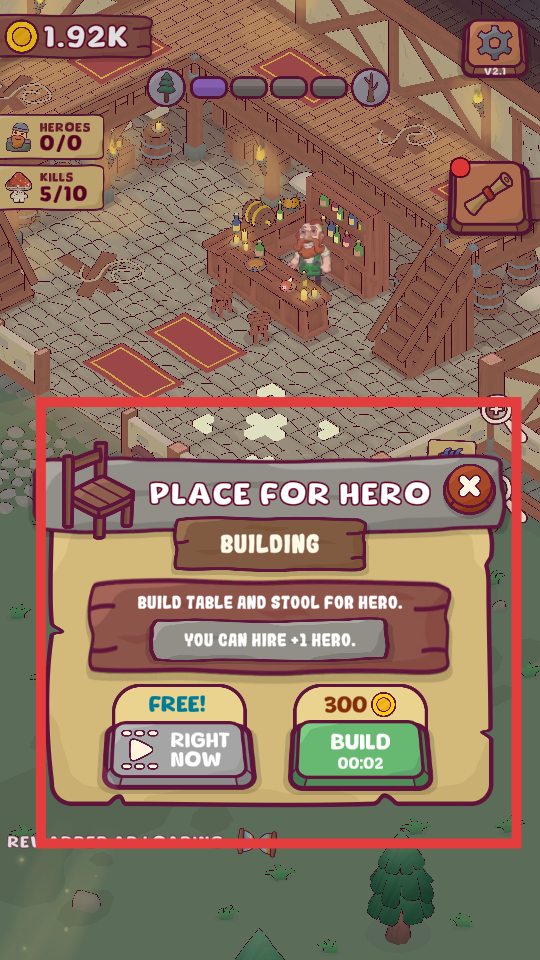 3、完成消滅怪物任務(wù)后,可進(jìn)行酒館建設(shè),比如建造英雄的桌椅,這樣就能雇傭更多英雄,提升酒館的吸引力。