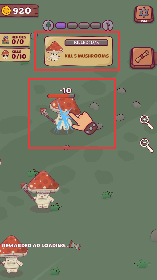 4、通過消滅怪物獲取金幣等資源,用資源建設(shè)酒館、雇傭英雄,不斷發(fā)展酒館,讓更多英雄愿意前來。