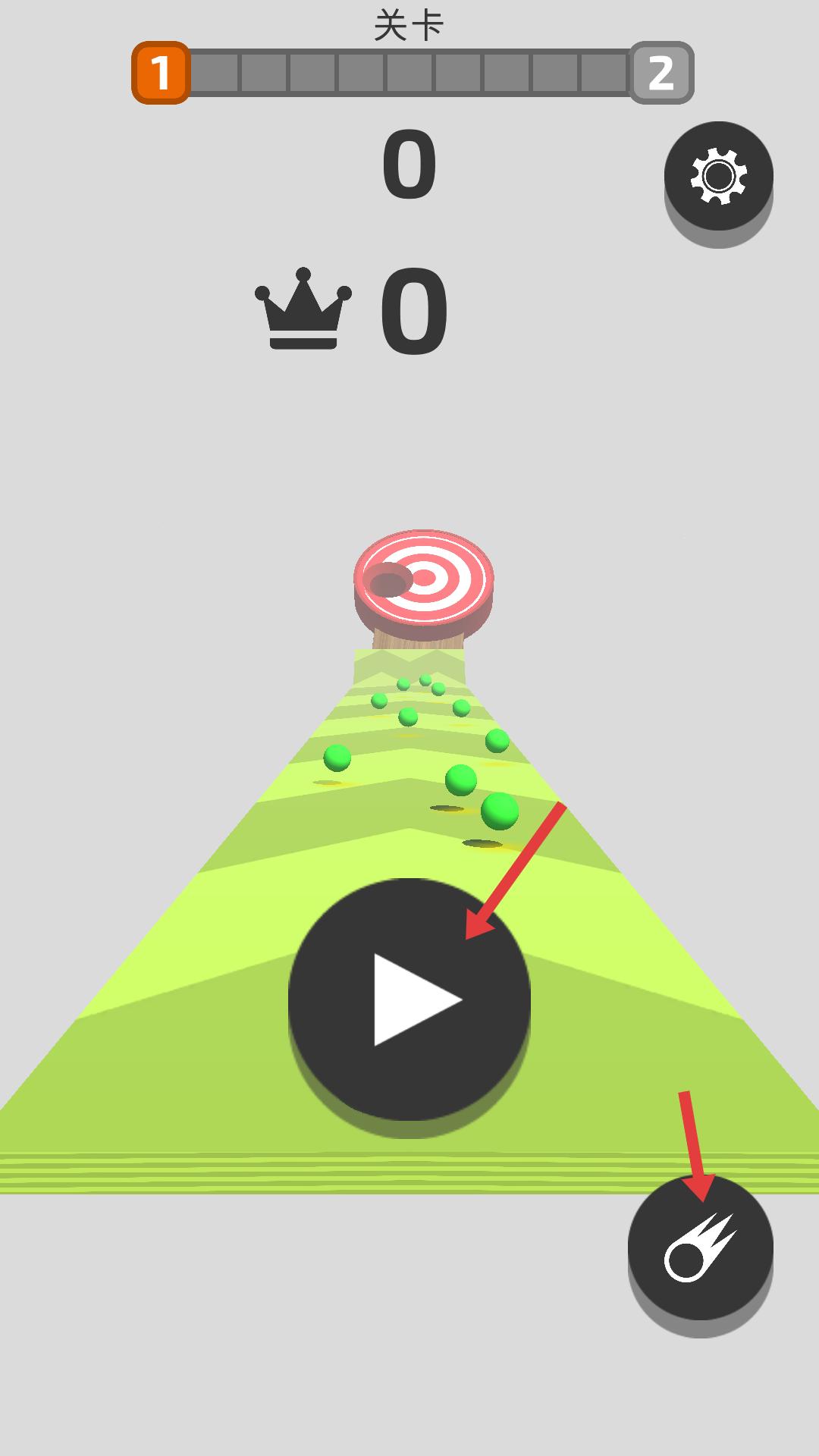 1、游戲開(kāi)始界面有播放按鈕和道具按鈕,點(diǎn)擊播放按鈕可進(jìn)入關(guān)卡,綠色路徑上有小球,目標(biāo)是讓小球到達(dá)紅色靶心,可利用道具助力。