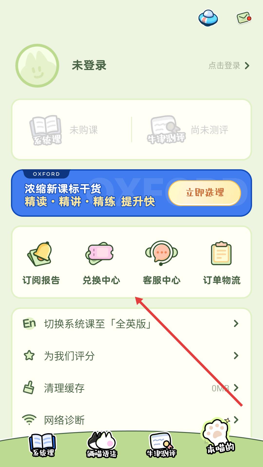 3、進(jìn)入洪恩兒童App本喵的頁面,設(shè)有訂閱報(bào)告、兌換中心等功能入口,方便用戶進(jìn)行相關(guān)操作與服務(wù)咨詢。