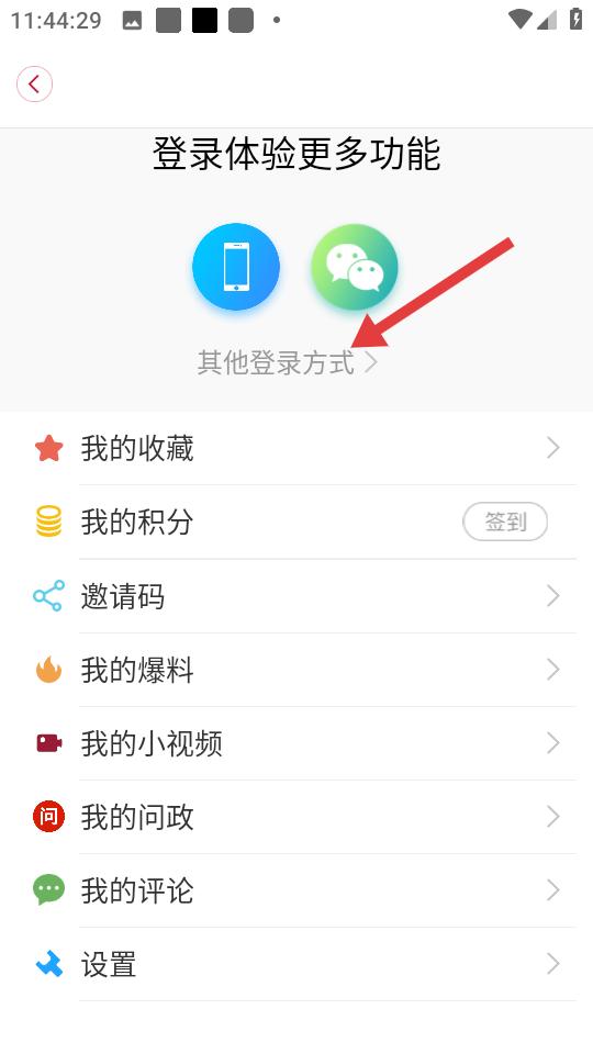 1、首頁右上角設有個人頭像入口,點擊進入登錄界面,箭頭指向其他登錄方式,開啟注冊流程第一步。