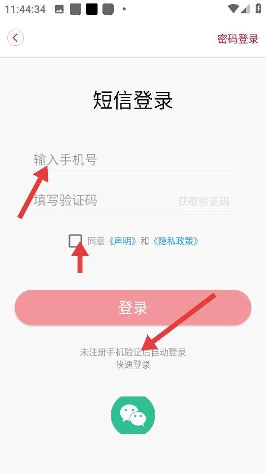 3、短信登錄頁,先在上方框輸入手機號,勾選同意聲明和隱私政策,點擊獲取驗證碼填入下方框,最后點粉色登錄按鈕,未注冊手機號也能完成驗證注冊。