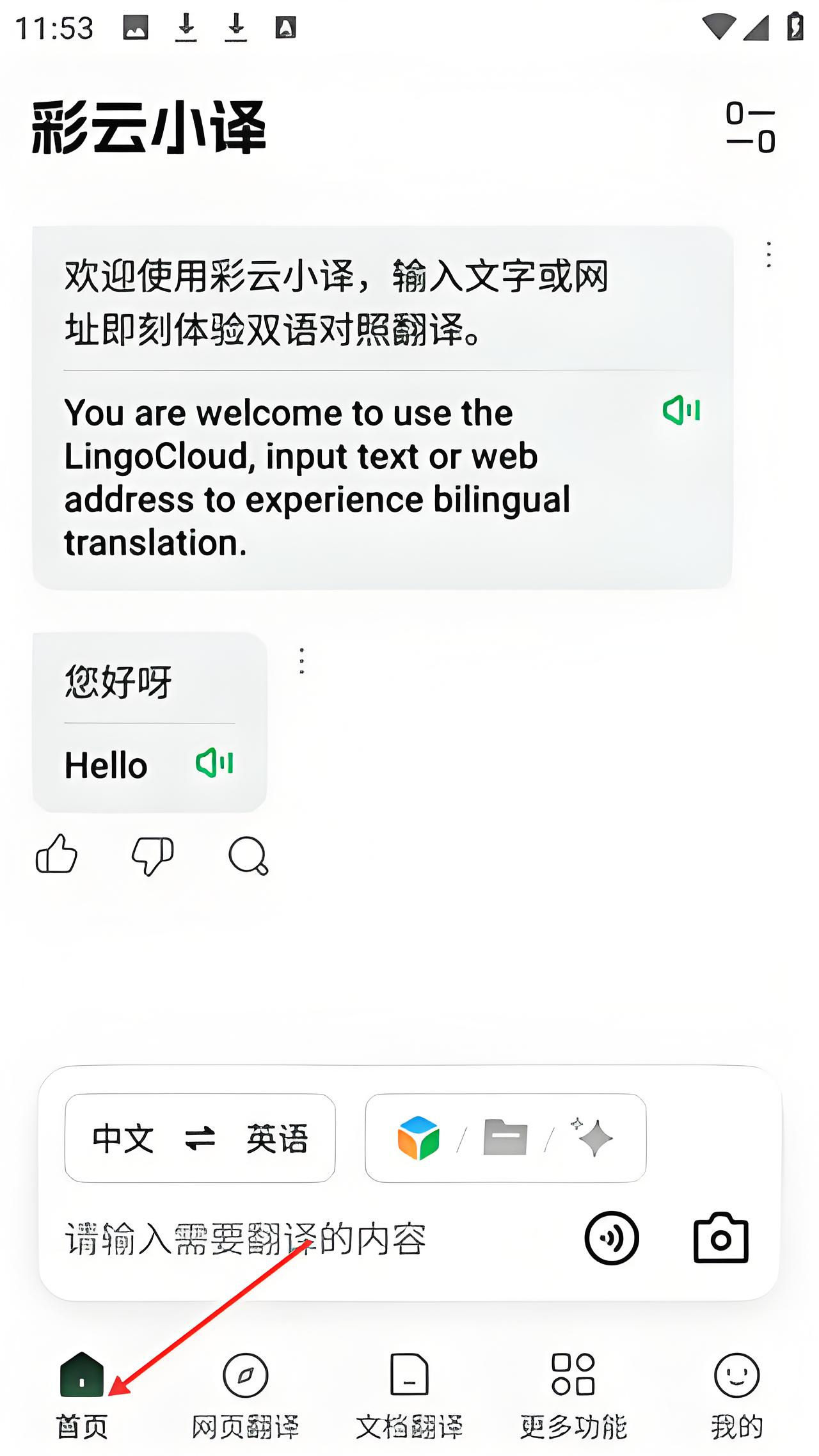 1、首頁可輸入文字或網(wǎng)址體驗(yàn)雙語對(duì)照翻譯,支持中英互譯,還有點(diǎn)贊、點(diǎn)踩等互動(dòng)功能,方便用戶進(jìn)行翻譯操作。
