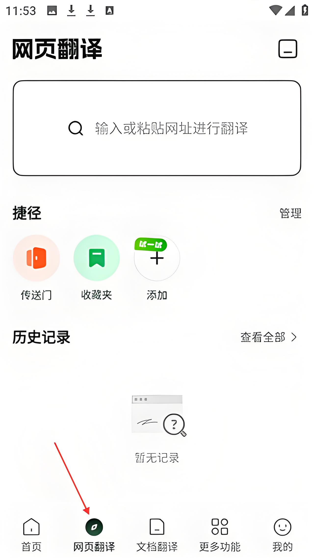 2、網(wǎng)頁翻譯頁面,能輸入或粘貼網(wǎng)址翻譯,設(shè)傳送門、收藏夾等捷徑,可查看歷史記錄,助力快速翻譯網(wǎng)頁內(nèi)容。
