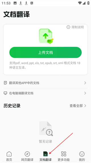 3、文檔翻譯界面可上傳PDF、Word等18種格式文檔,支持多語言互譯,也能翻譯其他APP及電腦端文檔滿足文檔翻譯需求。