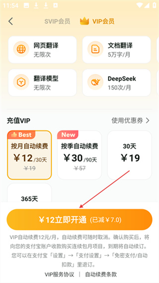 4、VIP會(huì)員頁面,有SVIP和VIP會(huì)員,含網(wǎng)頁翻譯無限次等權(quán)益,充值VIP有多種套餐,可12元開通自動(dòng)續(xù)費(fèi)可隨時(shí)取消。