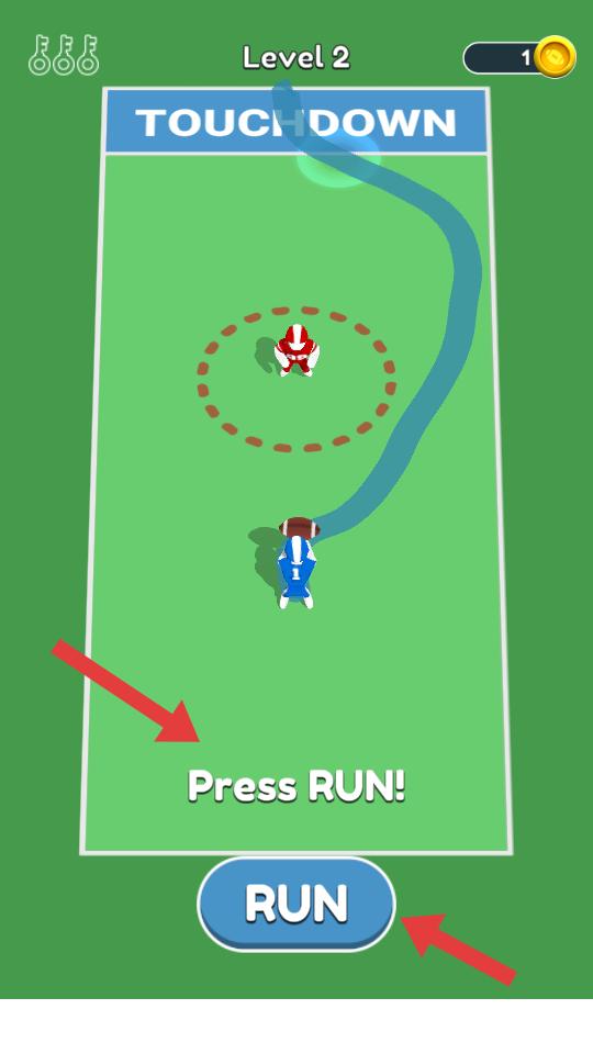 3、游戲過程中,看到Press RUN提示時(shí),點(diǎn)擊RUN按鈕,讓角色帶著橄欖球朝著目標(biāo)方向沖刺,完成關(guān)卡任務(wù)。
