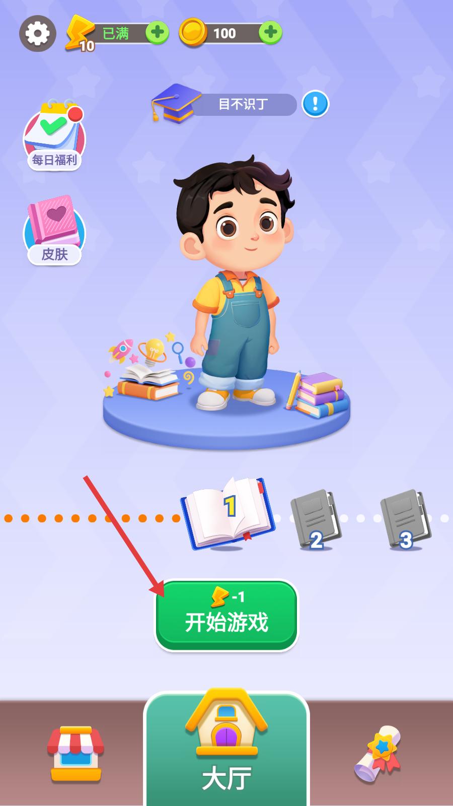 1、打開腦洞詞場后,進(jìn)入佳作主界面,看到有開始游戲按鈕,點(diǎn)擊該按鈕,即可進(jìn)入關(guān)卡1的游戲場景。