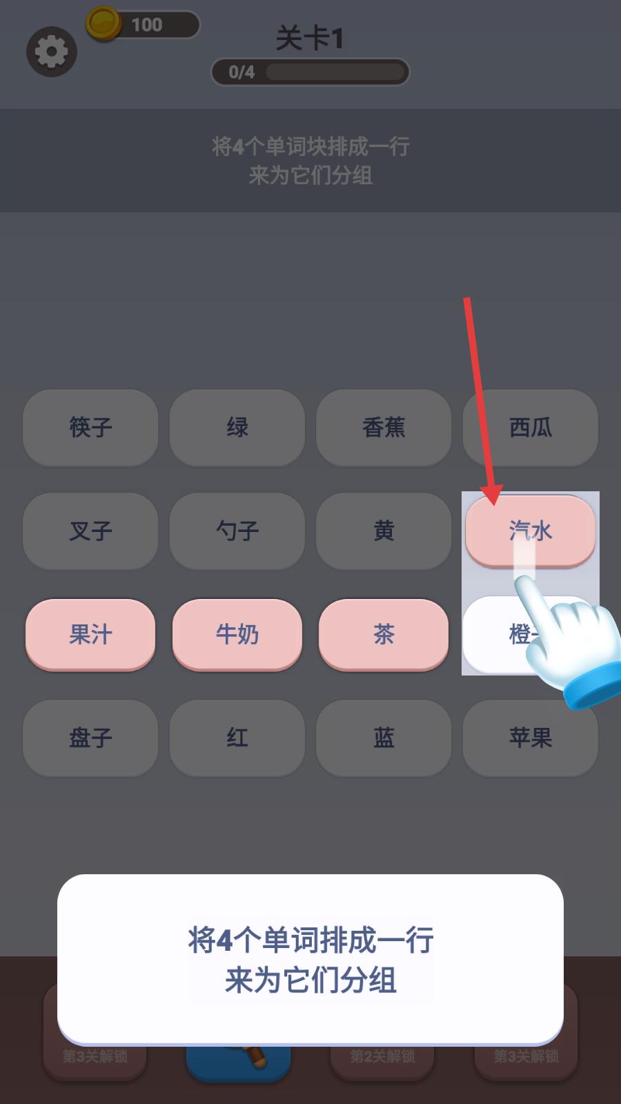 2、在關(guān)卡1中需要將4個單詞排成一行來分組,按照提示,點(diǎn)擊相應(yīng)的單詞塊,開始進(jìn)行單詞分組操作。