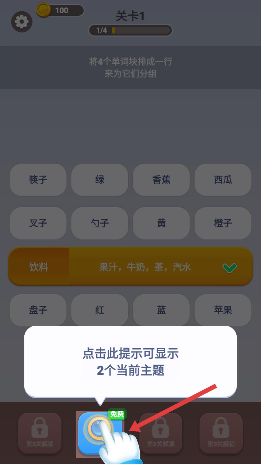 3、完成單詞分組后,界面下方有提示按鈕,點(diǎn)擊該按鈕,可顯示2個當(dāng)前主題,繼續(xù)推進(jìn)佳作進(jìn)程。