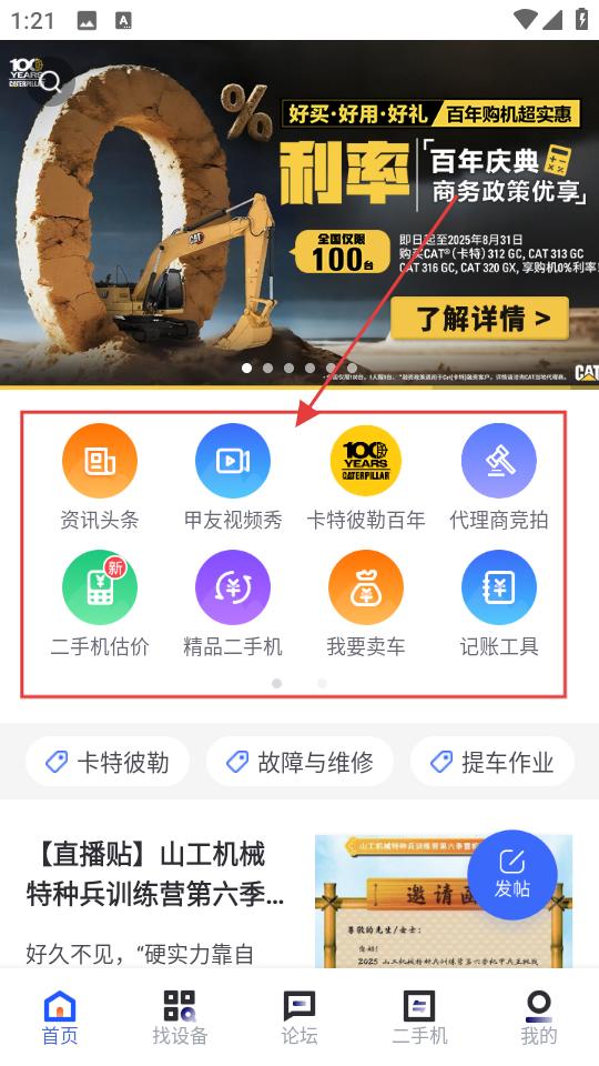 1、打開工程機械A(chǔ)PP,進入首頁點擊卡特彼勒百年等功能按鈕,瀏覽資訊頭條甲友視頻秀等板塊,了解行業(yè)動態(tài)。