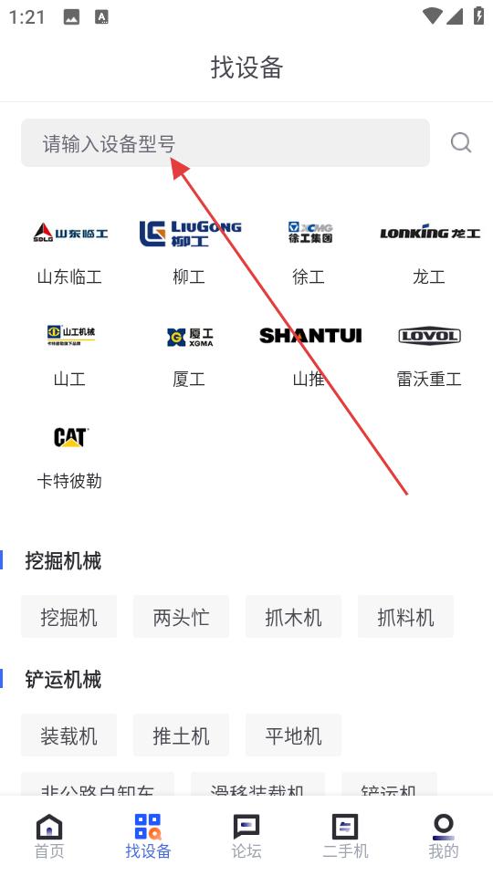 2、切換到找設(shè)備頁面,在搜索欄輸入設(shè)備型號,篩選山東臨工柳工等品牌,查找挖掘機械鏟運機械等設(shè)備。