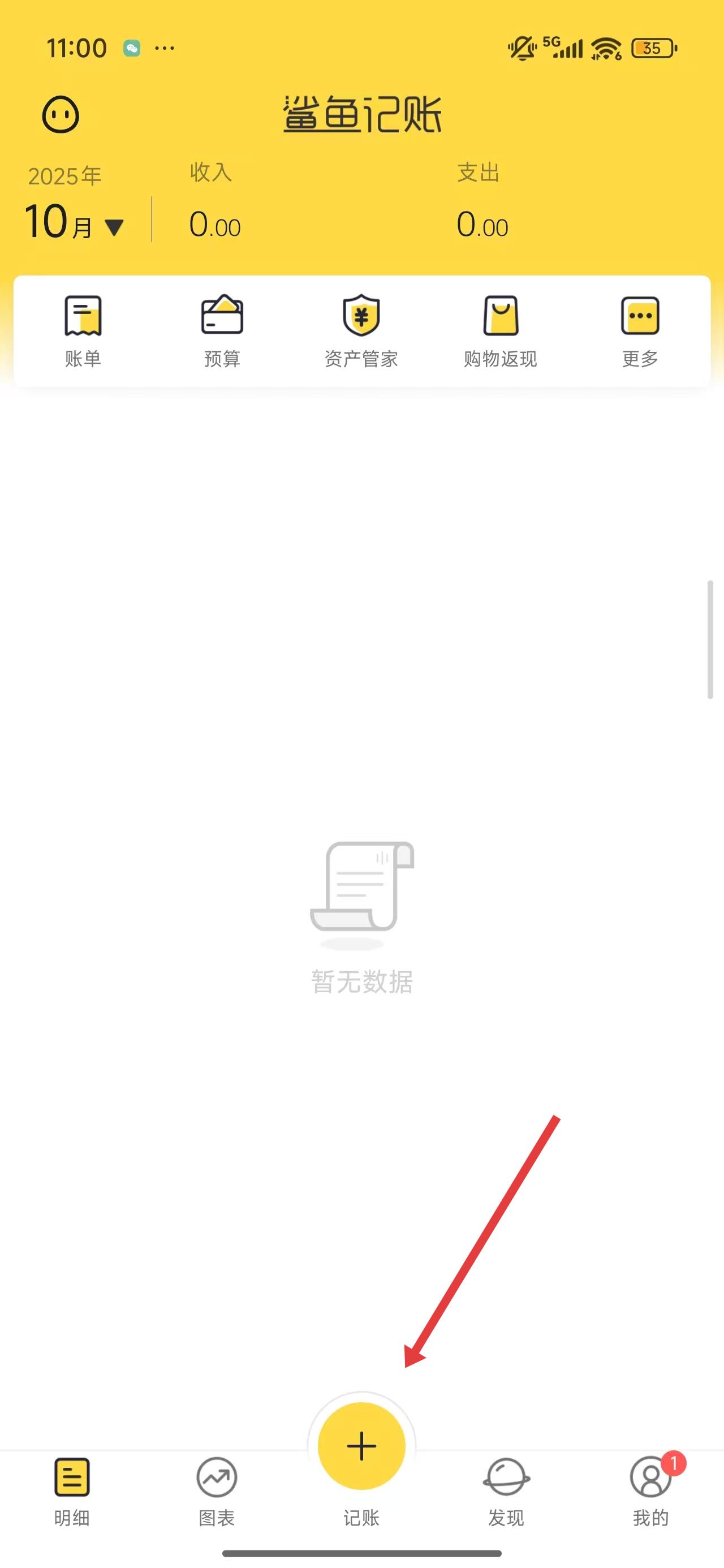 1、打開(kāi)鯊魚(yú)記賬軟件后,點(diǎn)擊底部的記賬按鈕,進(jìn)入記賬操作界面。