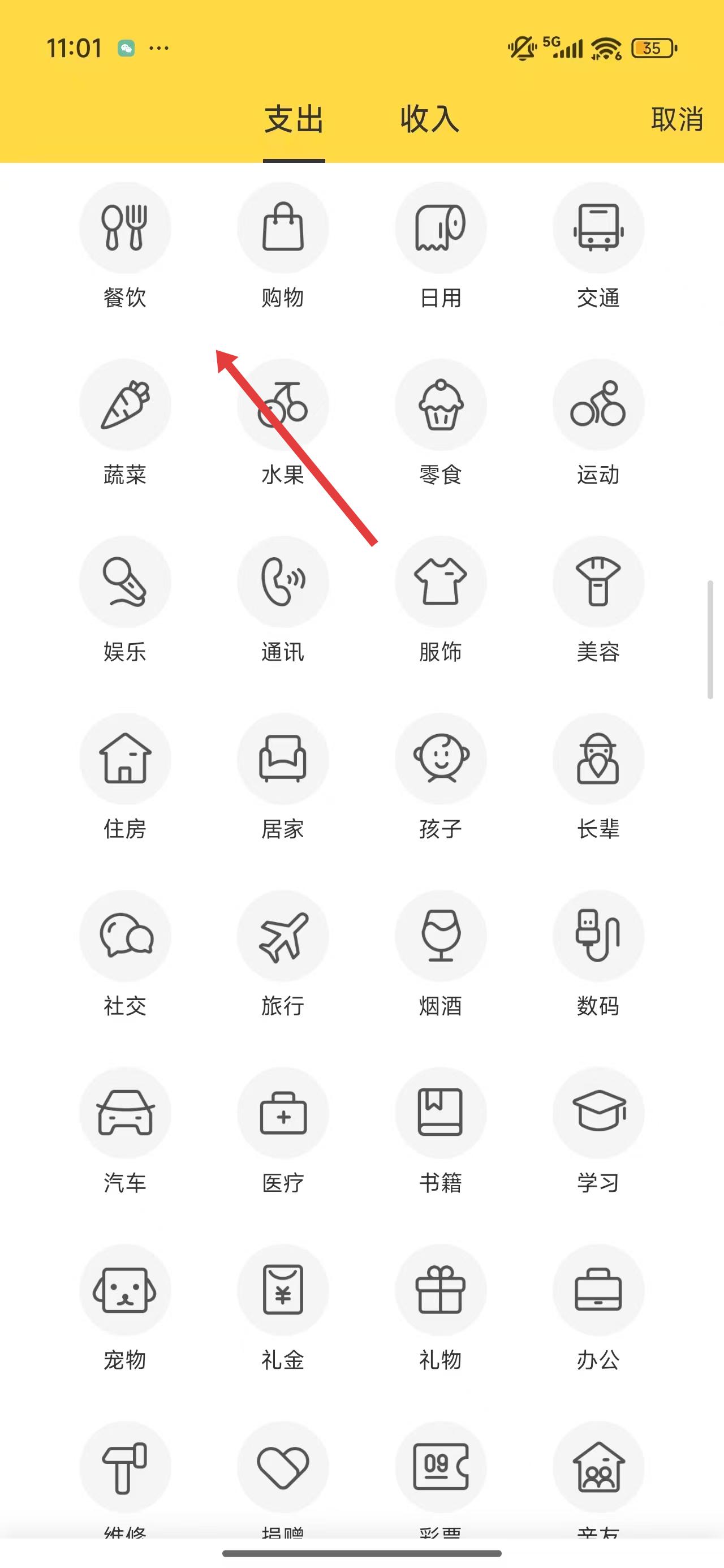 2、在支出或收入分類(lèi)界面,挑選對(duì)應(yīng)的消費(fèi)類(lèi)別,如餐飲、購(gòu)物等,確定消費(fèi)類(lèi)型。