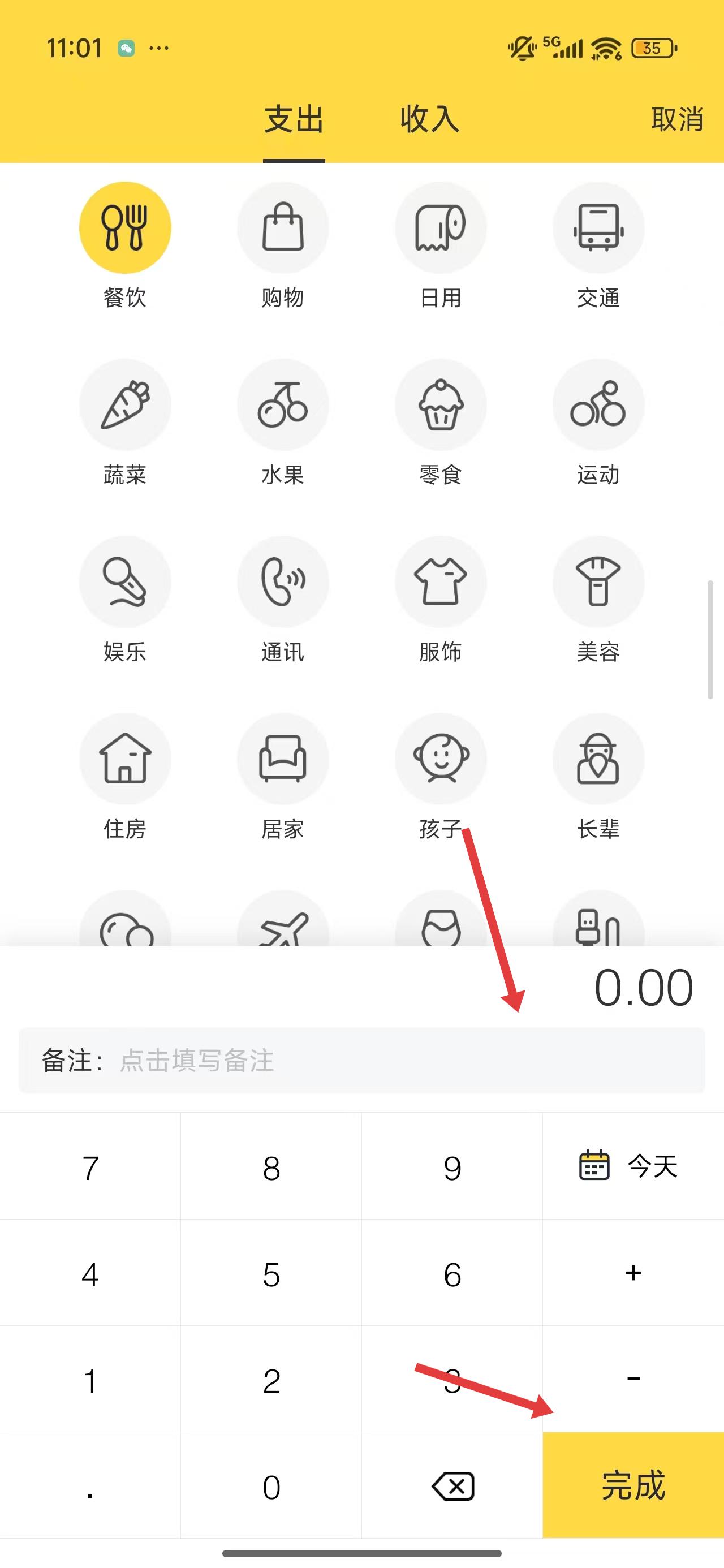 3、選擇好消費(fèi)類(lèi)別后,輸入具體的消費(fèi)金額,還可填寫(xiě)備注信息,完成后點(diǎn)擊完成按鈕。