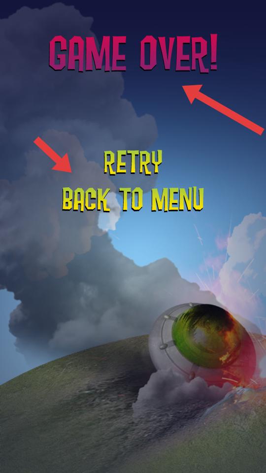4、若游戲失敗,出現(xiàn)GAME OVER的界面,此時有RETRY和BACK TO MENU兩個選項,根據(jù)需求,選擇其中一個選項,比如BACK TO MENU回到游戲主菜單界面。
