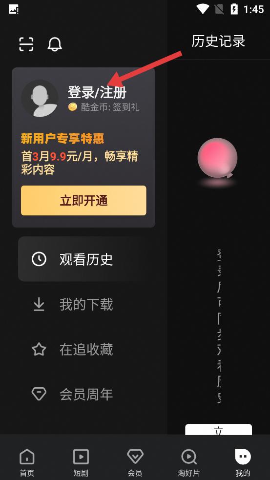 1、在APP我的頁面,點(diǎn)擊登錄注冊入口,可看到新用戶特惠、觀看歷史等,按指引操作,開啟賬號相關(guān)功能。