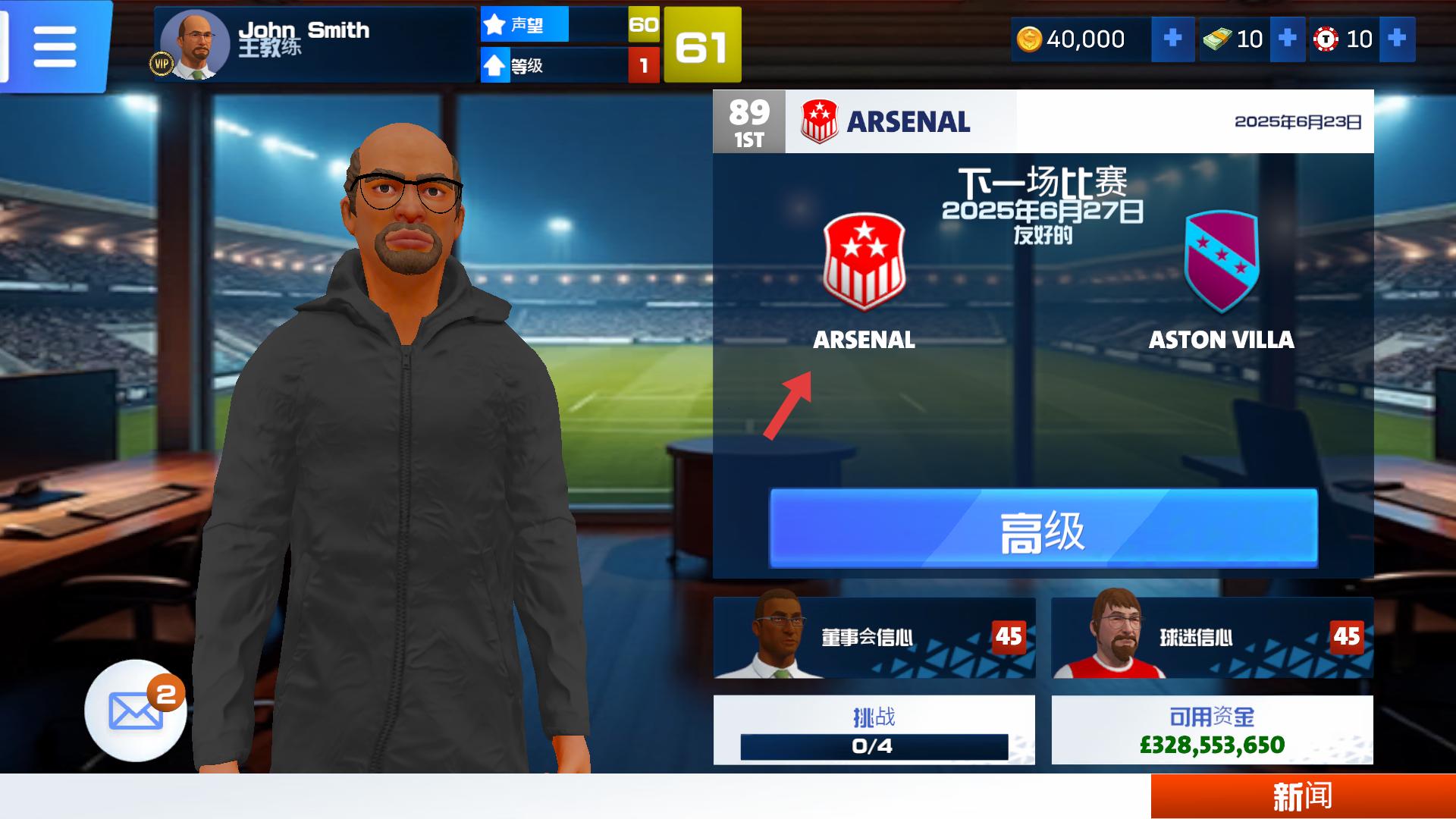 3、進(jìn)入主界面后,能查看球隊(duì)下一場(chǎng)比賽信息,包括對(duì)手、日期等,還可關(guān)注董事會(huì)信心、球迷信心等數(shù)據(jù),為比賽策略制定做準(zhǔn)備。