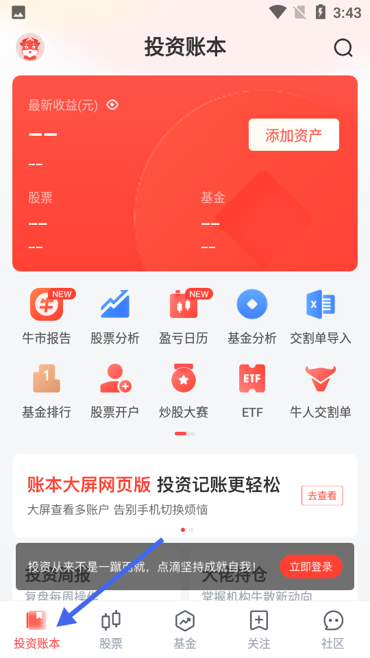 1、投資賬本首頁,突顯最新收益,設(shè)添加資產(chǎn)按鈕,集成股票分析等多樣功能,還推薦大屏網(wǎng)頁版提升記賬體驗。