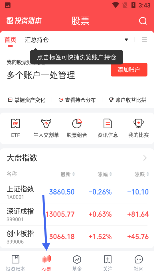 點擊“添加賬戶”按鈕,添加您的股票賬戶,隨時查看股票持倉狀況。