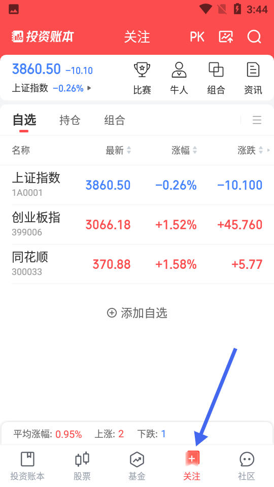 4、關(guān)注頁面涵蓋比賽、資訊等板塊,支持自選股管理,實時更新上證指數(shù)等信息,為用戶提供投資參考與便捷操作。