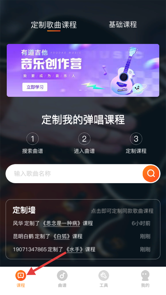 1、吉他學(xué)習(xí)APP的課程界面區(qū)分定制與基礎(chǔ)課程,可按三步定制彈唱課,還展示他人定制記錄并有音樂創(chuàng)作營推薦。