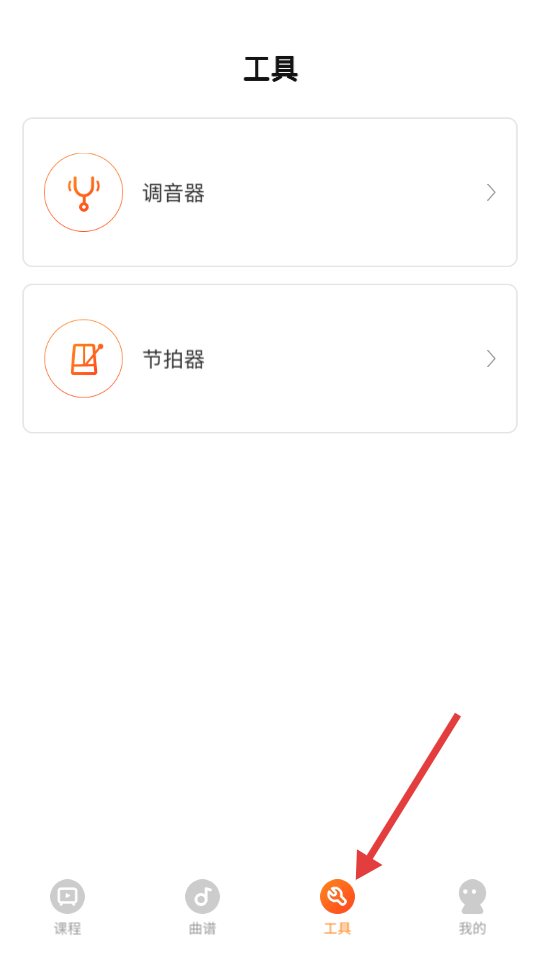 3、點(diǎn)擊工具頁面提供調(diào)音器、節(jié)拍器,助力吉他調(diào)音與節(jié)奏把控,底部導(dǎo)航清晰便于在課程曲譜等板塊間切換。