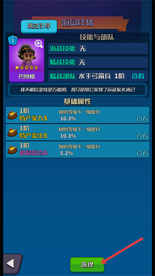2、選擇海員如巴圖姆,查看其海戰(zhàn)技能、陸戰(zhàn)技能等屬性,點擊選擇將其加入艦隊,增強艦隊實力。