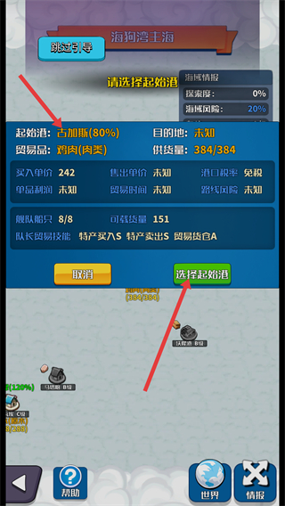 4、選擇起始港如古加那,查看貿易品、供需量等信息,點擊選擇起始港,開始遠洋貿易,獲取收益。
