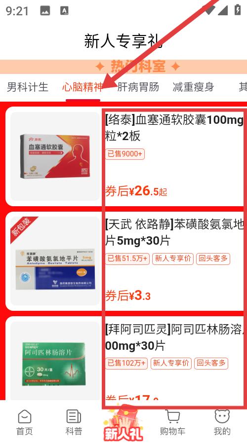 3、新人專享禮心腦精神專區(qū)明確血塞通軟膠囊等藥品展示,已售數(shù)量與新人專享價(jià)標(biāo)注,券后價(jià)格突出,方便心腦精神疾病患者篩選優(yōu)惠藥品。