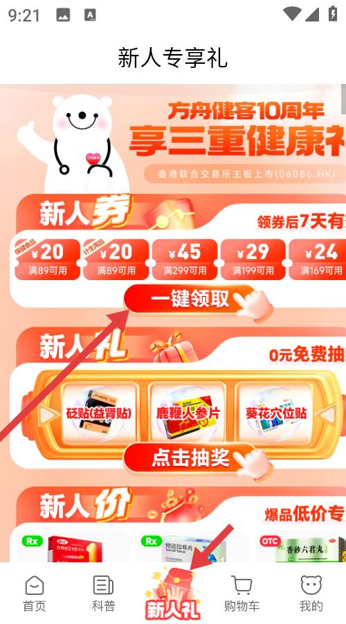 1、新人專享禮福利板塊清晰新人券滿減額度多樣,一鍵領(lǐng)取便捷,新人禮抽獎(jiǎng)含益腎貼等好物,底部新人禮入口醒目,助力新用戶快速領(lǐng)取福利。