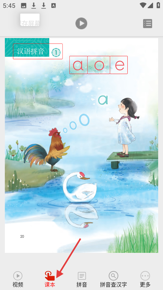 1、課本頁顯示漢語拼音學習,呈現(xiàn)a、o、e,搭配童趣插圖,底部有視頻課本等導航選項,可切換學習模式。