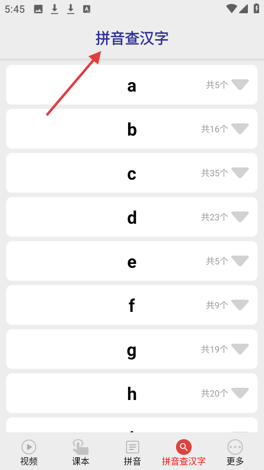 2、拼音查漢字界面,按字母排列,顯示各字母對應漢字數(shù)量,方便用戶依據(jù)拼音查找漢字。