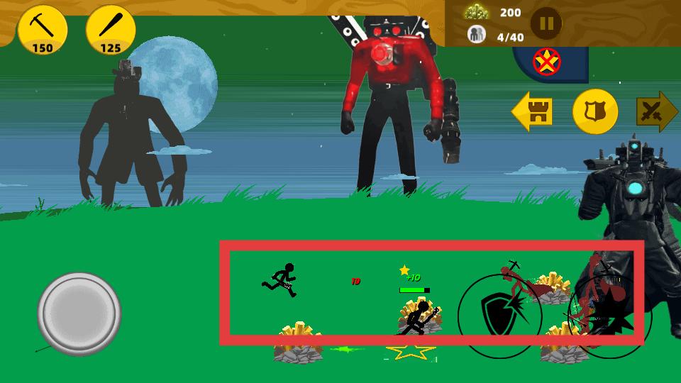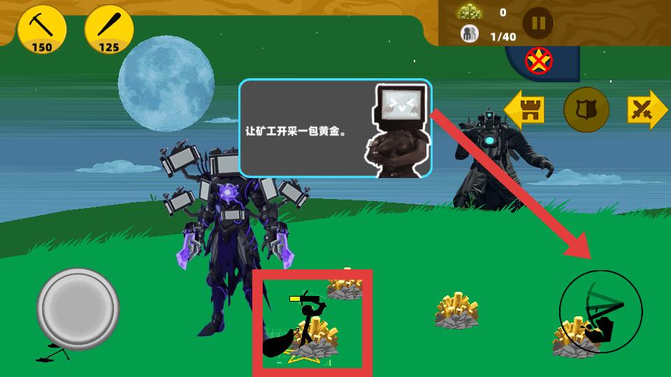 3、玩家需要通過屏幕左下角的虛擬搖桿控制火柴人角色移動,利用技能按鈕操控火柴人進(jìn)行攻擊、防御等操作,指揮火柴人軍團與敵人戰(zhàn)斗。