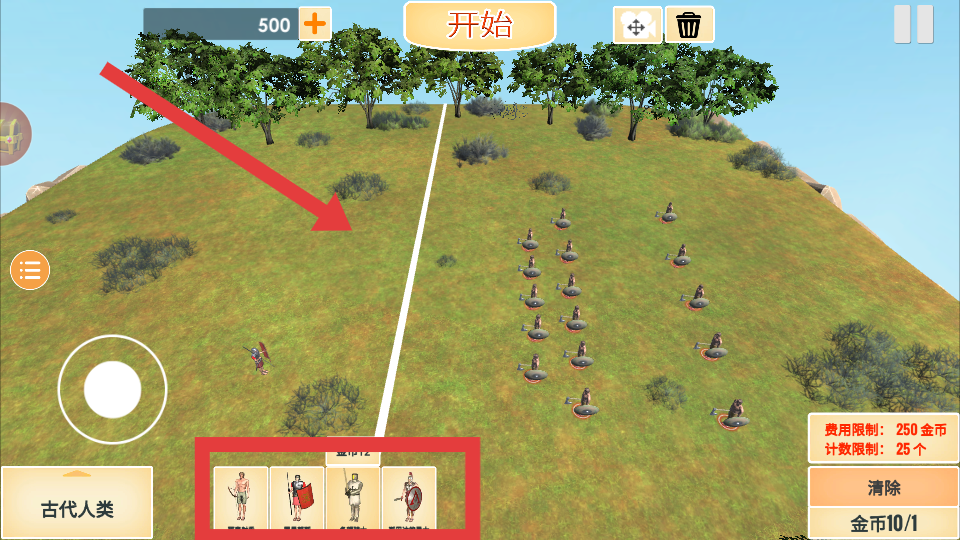 2、進(jìn)入戰(zhàn)斗準(zhǔn)備界面后從下方的單位列表中選擇古代人類等作戰(zhàn)單位,點(diǎn)擊并放置到戰(zhàn)場(chǎng)合適位置,合理布局作戰(zhàn)單位,構(gòu)建初始戰(zhàn)斗陣容。