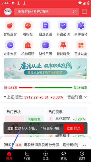 1、首頁有股票搜索欄,設(shè)智能避雷等功能,展示漲跌家數(shù)、上證指數(shù)等行情,還有熱門板塊、股票信息,提示登錄解鎖更多功能。