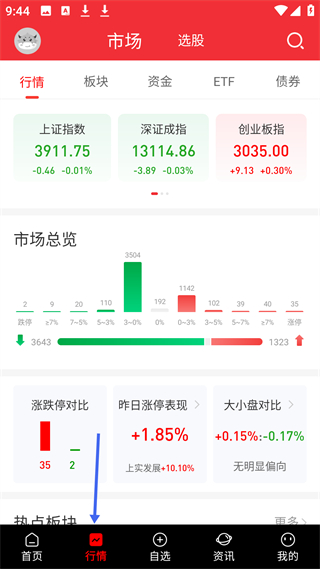 2、行情頁面呈現(xiàn)上證指數(shù)等指數(shù)數(shù)據(jù),有市場總覽,展示漲跌停及不同漲跌幅區(qū)間個(gè)股數(shù)量,還有漲跌停對比等板塊方便查看市場全貌。