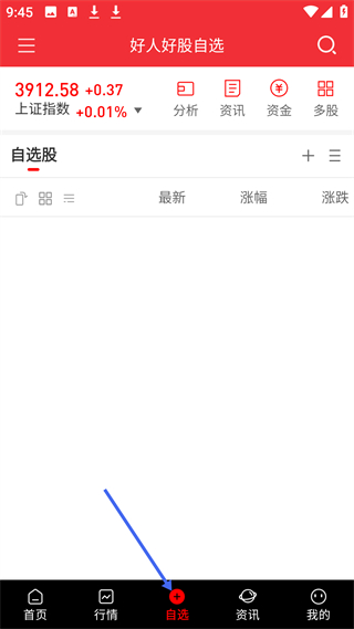 3、自選股頁面顯示上證指數(shù),可添加自選股,提供分析、資訊等功能,便于用戶管理關(guān)注的股票,及時(shí)掌握其最新動態(tài)。