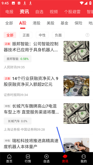 4、資訊頁面分電報(bào)、資訊等板塊,涵蓋A股等市場,展示振邦智能、長城汽車等個(gè)股及行業(yè)融資相關(guān)資訊助力用戶了解市場信息。