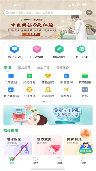 1、首頁有線上問診、HPV專區(qū)等功能,入學(xué)查驗(yàn)、預(yù)約掛號(hào)等常用服務(wù),還有中醫(yī)辨證0元體驗(yàn)活動(dòng),服務(wù)豐富且有優(yōu)惠。