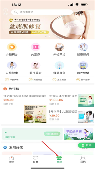 3、商城板塊有小額積分、體檢預(yù)約等服務(wù),熱銷秋梨膏、體檢套餐等,商品品類豐富,還有步數(shù)兌換健康幣活動(dòng)。
