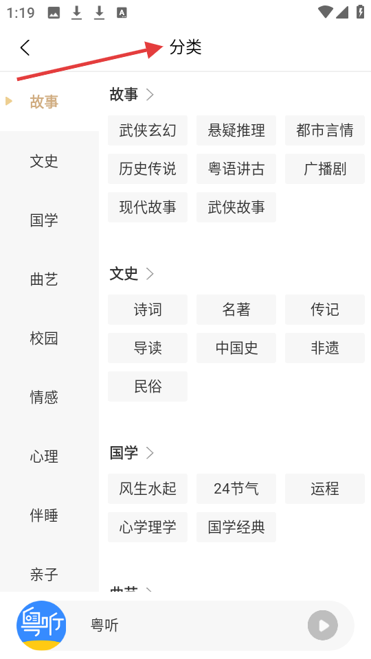 2、分類頁(yè)面中粵聽(tīng)將內(nèi)容細(xì)致劃分,含故事、文史、國(guó)學(xué)等類別,故事下又分武俠玄幻、懸疑推理等,便于精準(zhǔn)查找。