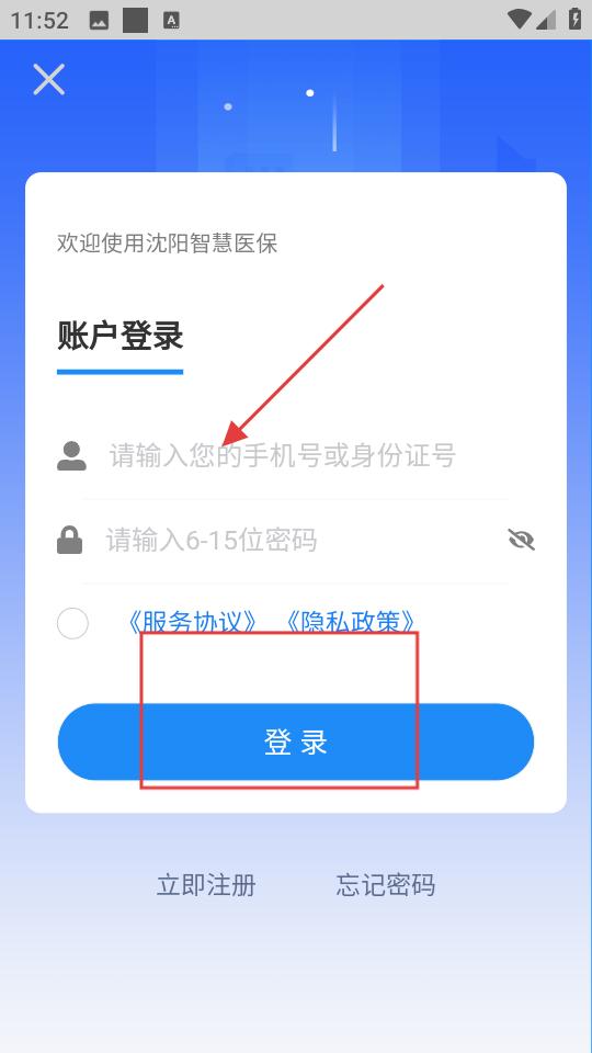 1、進(jìn)入賬戶登錄頁面,輸入手機(jī)號碼或身份證號,填寫密碼,勾選服務(wù)協(xié)議與隱私政策,點(diǎn)擊登錄按鈕完成賬號登錄。