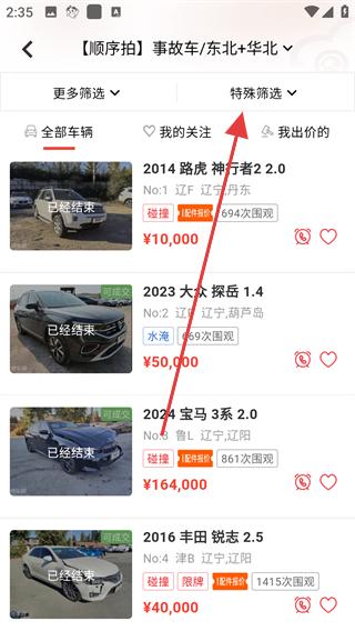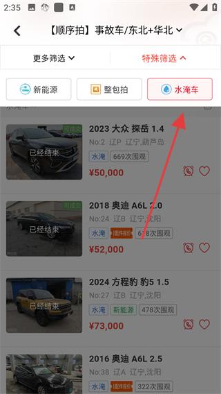 2、在車輛列表頁面點擊特殊篩選按鈕,展開篩選選項,可選擇如新能源車、整包拍、水淹車等篩選條件,縮小車輛搜索范圍。