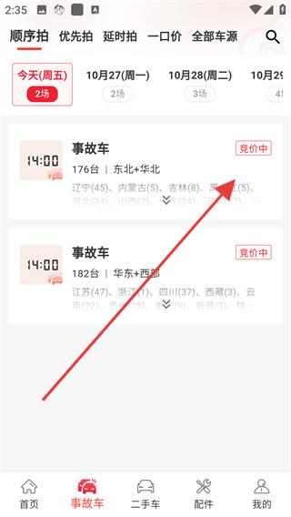 1、進入事故車板塊可查看不同日期的事故車競價場次,選擇感興趣的場次,如10月27日的東北華北場次,進入車輛列表頁面。