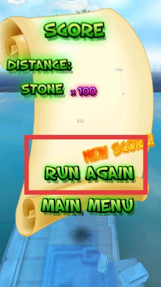 3、當(dāng)熊貓在跑酷過程中碰到障礙物,游戲結(jié)束,會顯示得分、奔跑距離等信息,此時點擊RUN AGAIN按鈕,可重新開始游戲,再次操控熊貓進(jìn)行跑酷。