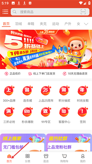1、首頁有上品25周年慶活動,5折基礎(chǔ)上1件85折、2件8折,還有300品牌等入口,支持線上下單門店發(fā)貨優(yōu)惠豐富。