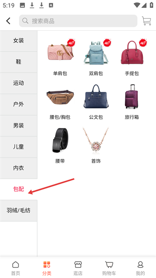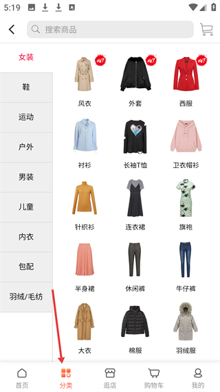 3、分類板塊有女裝、鞋、運(yùn)動等分類,女裝下有風(fēng)衣、外套等細(xì)分,包配類有單肩包、雙肩包等,分類細(xì)致。