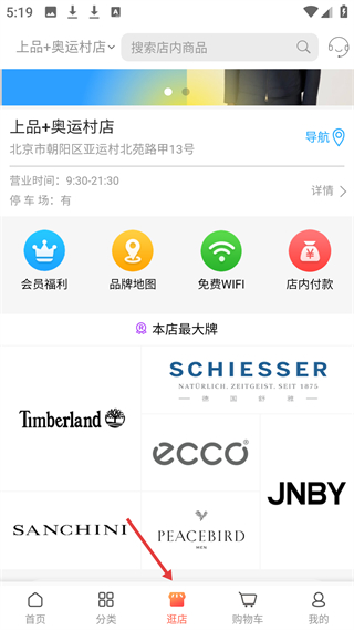 4、逛店板塊展示上品奧運(yùn)村店,位于北京朝陽區(qū),有會員福利等功能,入駐品牌有Timberland等門店信息清晰。