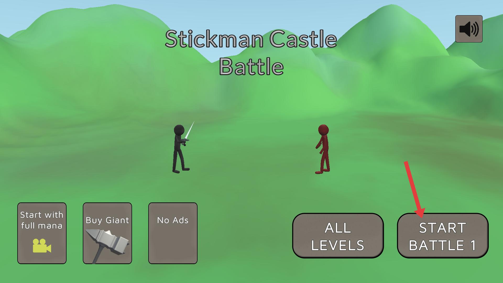 1、游戲初始界面點(diǎn)擊箭頭所指按鈕,點(diǎn)擊該按鈕可進(jìn)入第一場(chǎng)戰(zhàn)斗,開啟與敵方火柴人的對(duì)戰(zhàn),推進(jìn)游戲進(jìn)程,體驗(yàn)戰(zhàn)斗玩法。